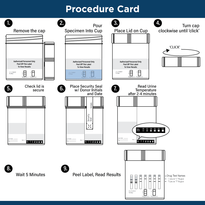 - Includes Temperature Strip to help validate urine sample