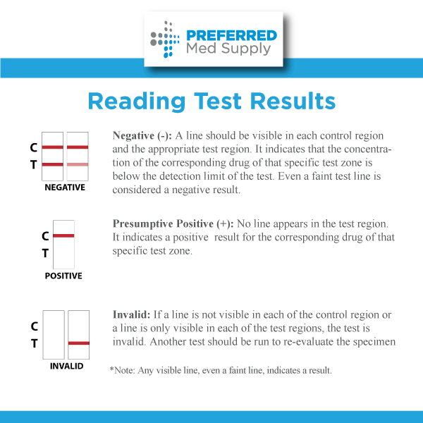 Negative (-): A line should be visible in each control region and the appropriate test region. It indicates that the concentration of the corresponding drug of that specific test zone is below the detection limit of the test. Even a faint test line is considered a negative result.